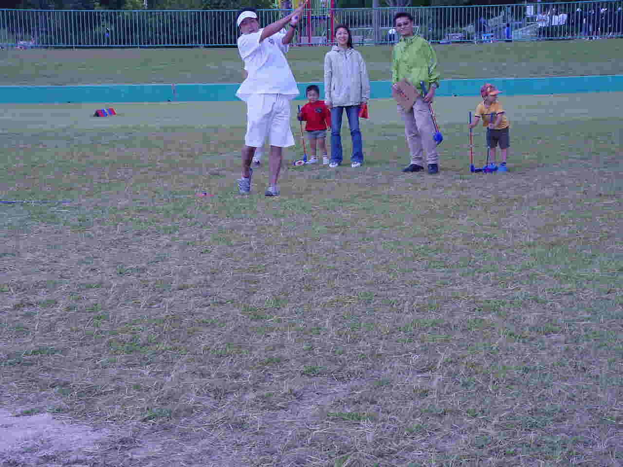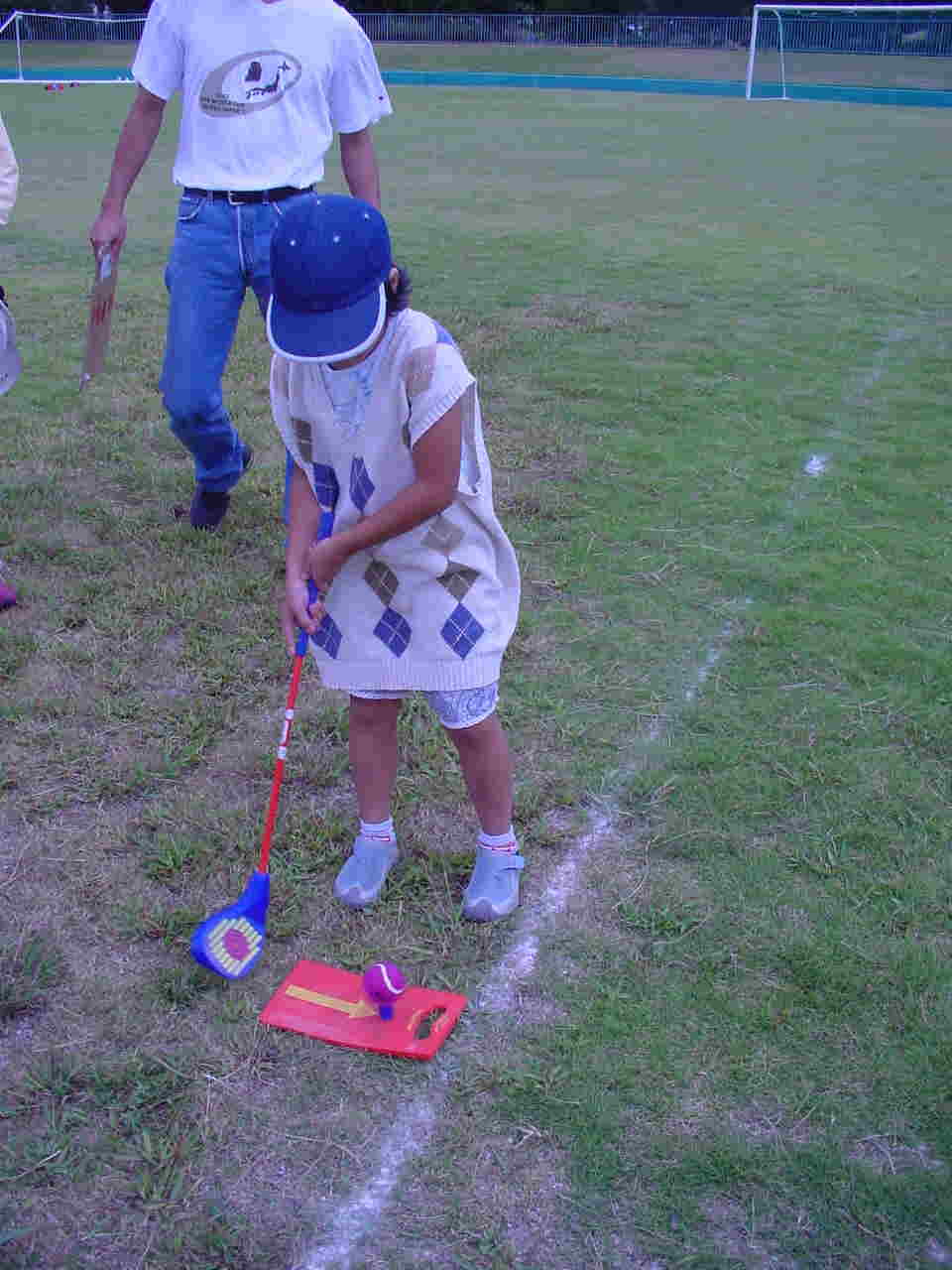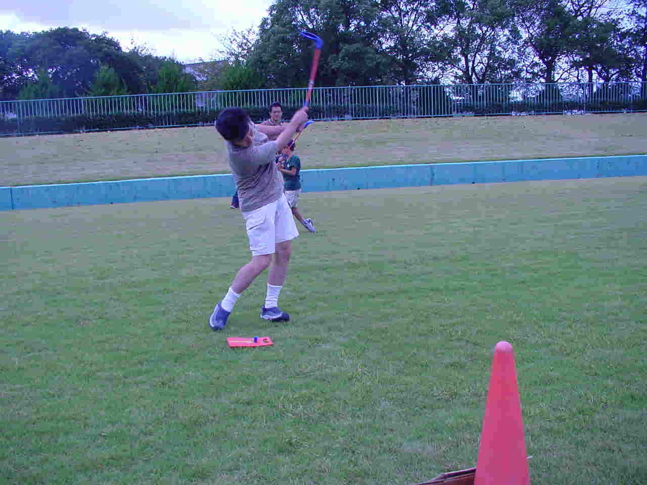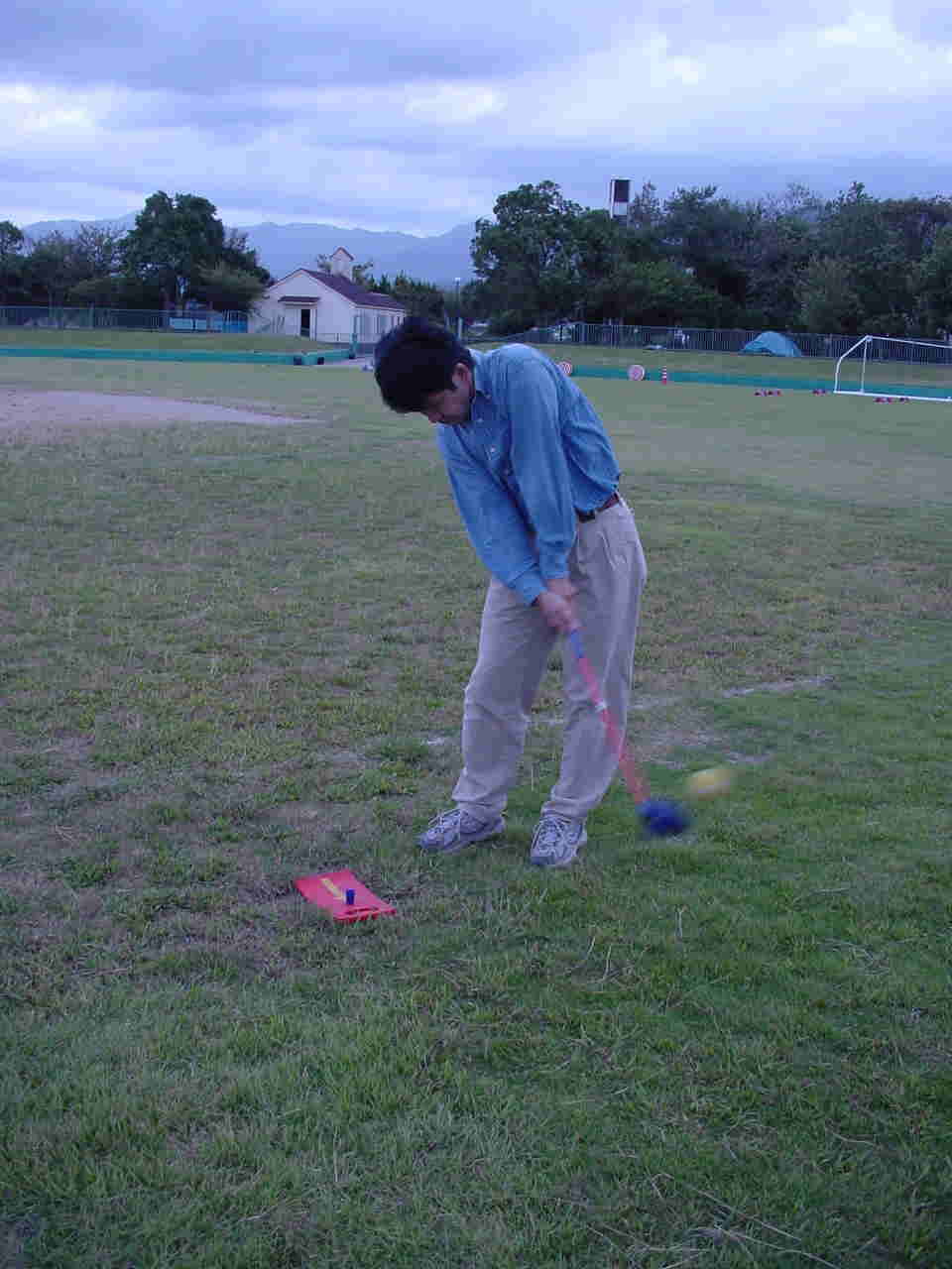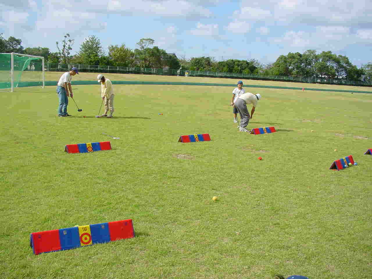 とりあえず天気が回復することを信じて、開催場所である西部運動公園に行きました。グラウンドは13:00からの使用です。準備に取りかかります。チラチラ入り口の方を見ますが、誰も来ません。来る気配が無いのです。練習のスペースを作って、コースも6ホールつくり・・・・・・・