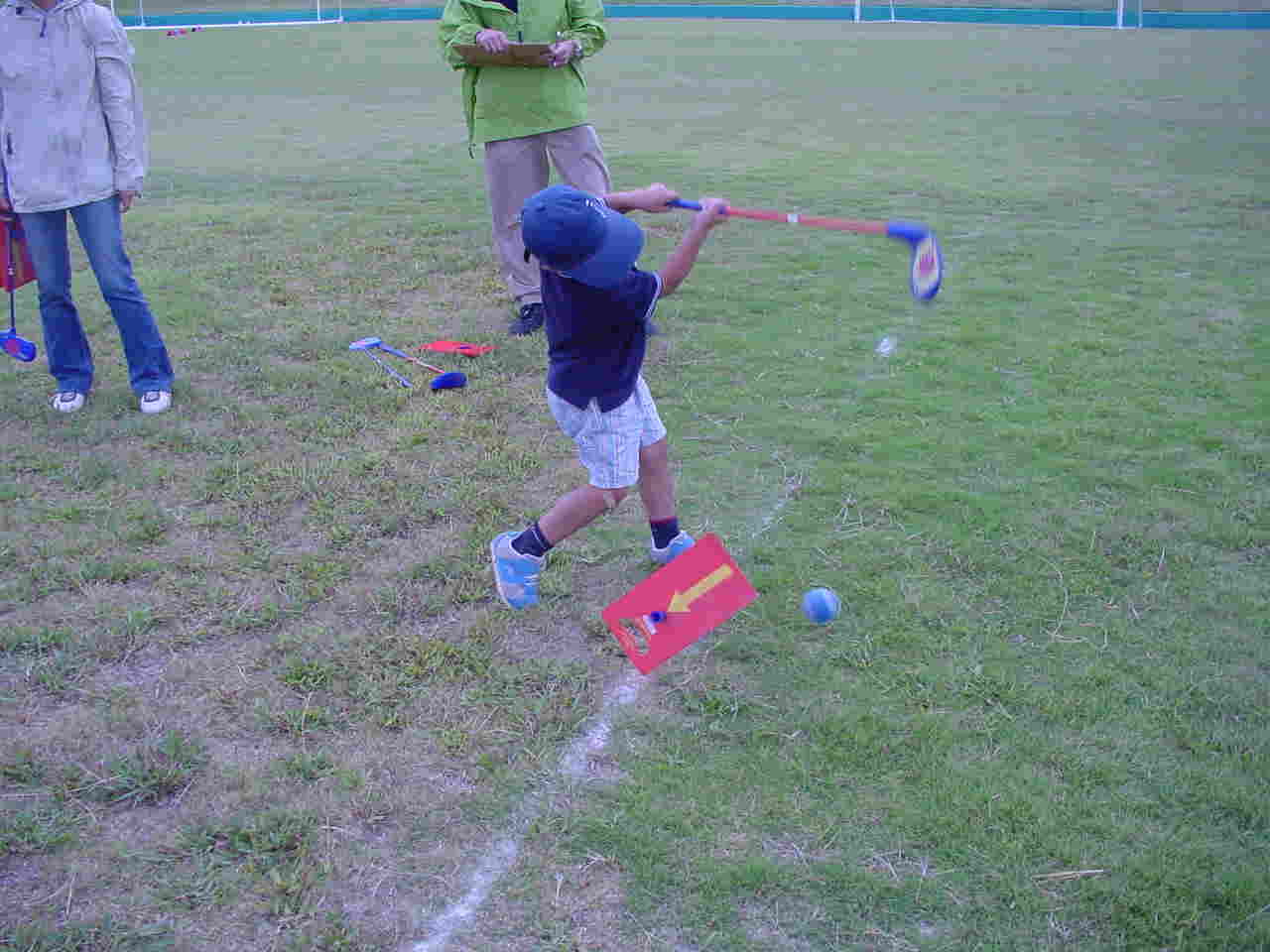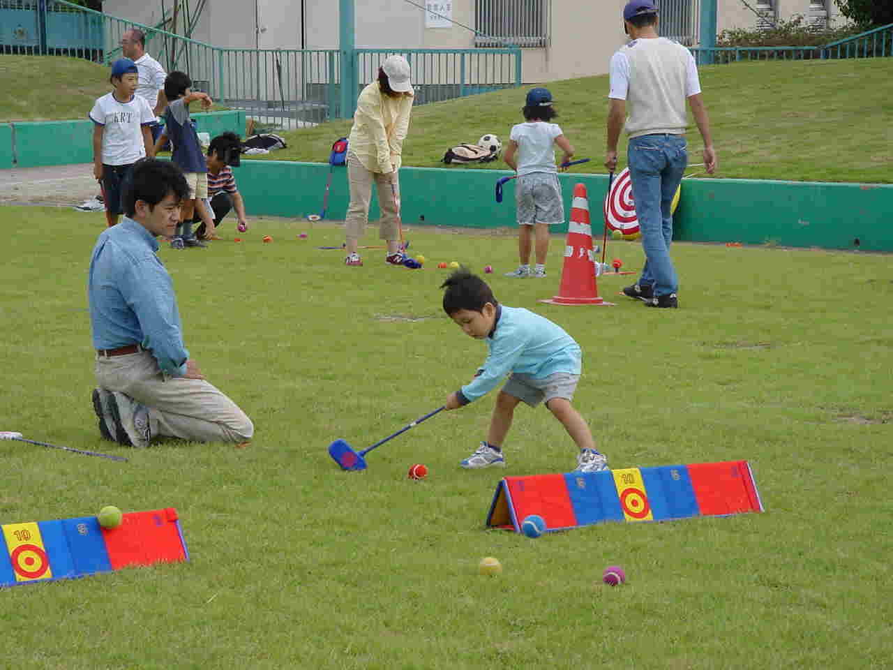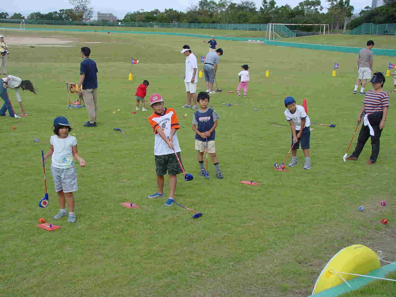 各グループとも一通り練習をして(練習時間は10〜15分)休憩をはさんでその後は、急造コースでのラウンドをしてもらいました。6ホール作って。親子で交互にボールを打ってもらい一緒にラウンドしていただきました。ショートホールではフラッグの代わりにボードを使って打数と点数を競いました。(約1時間で終了)