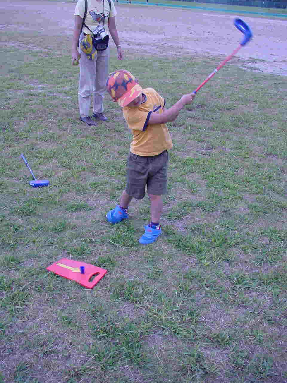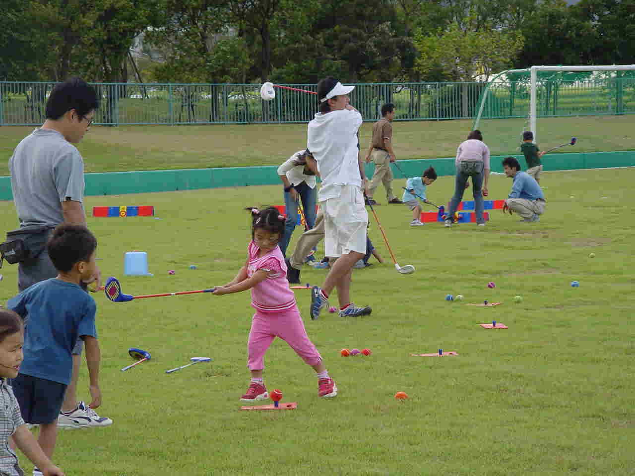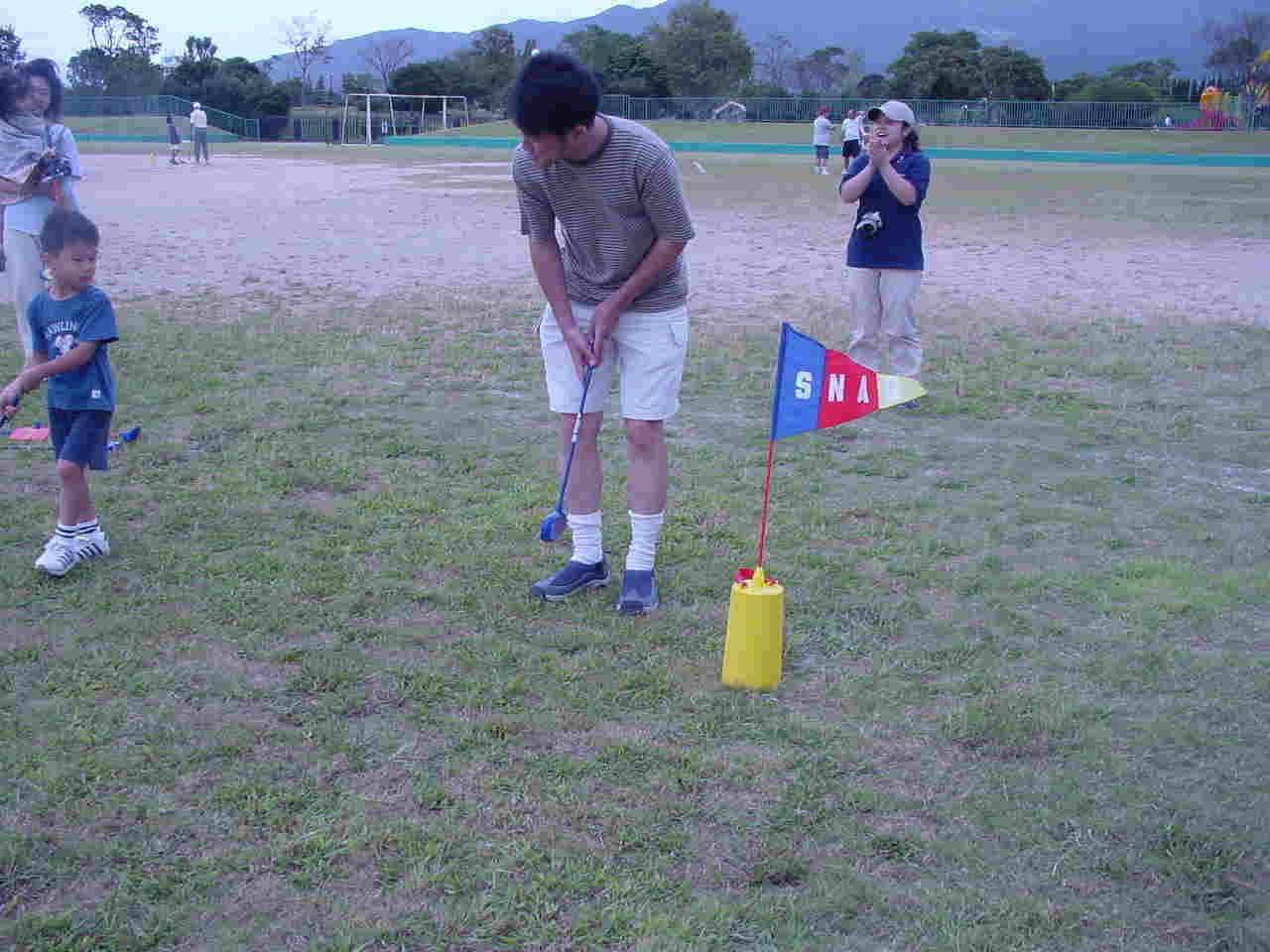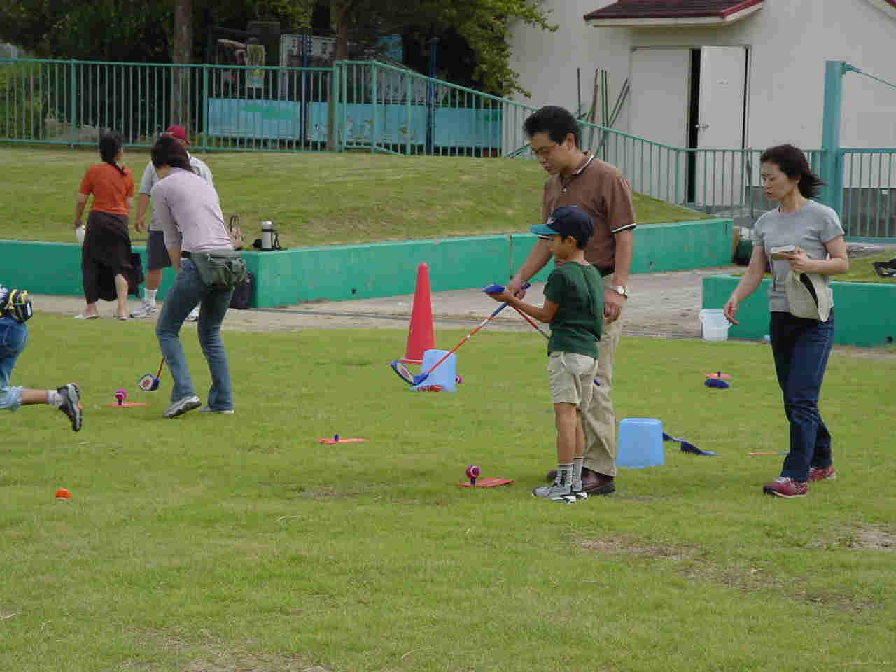 各グループとも一通り練習をして(練習時間は10〜15分)休憩をはさんでその後は、急造コースでのラウンドをしてもらいました。6ホール作って。親子で交互にボールを打ってもらい一緒にラウンドしていただきました。ショートホールではフラッグの代わりにボードを使って打数と点数を競いました。(約1時間で終了)